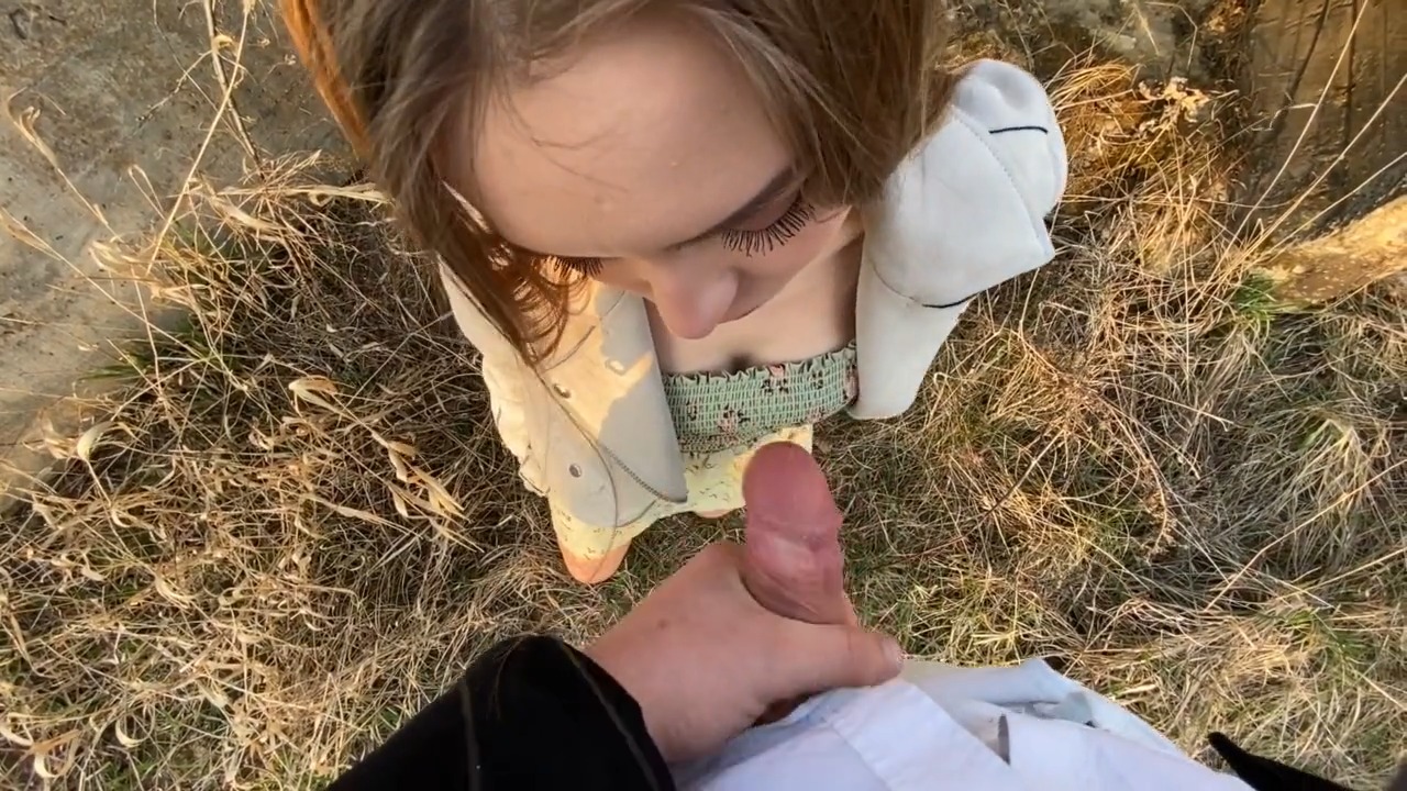 Мужик дает в рот рыжей зеленоглазой милашке и кончает ей на лицо